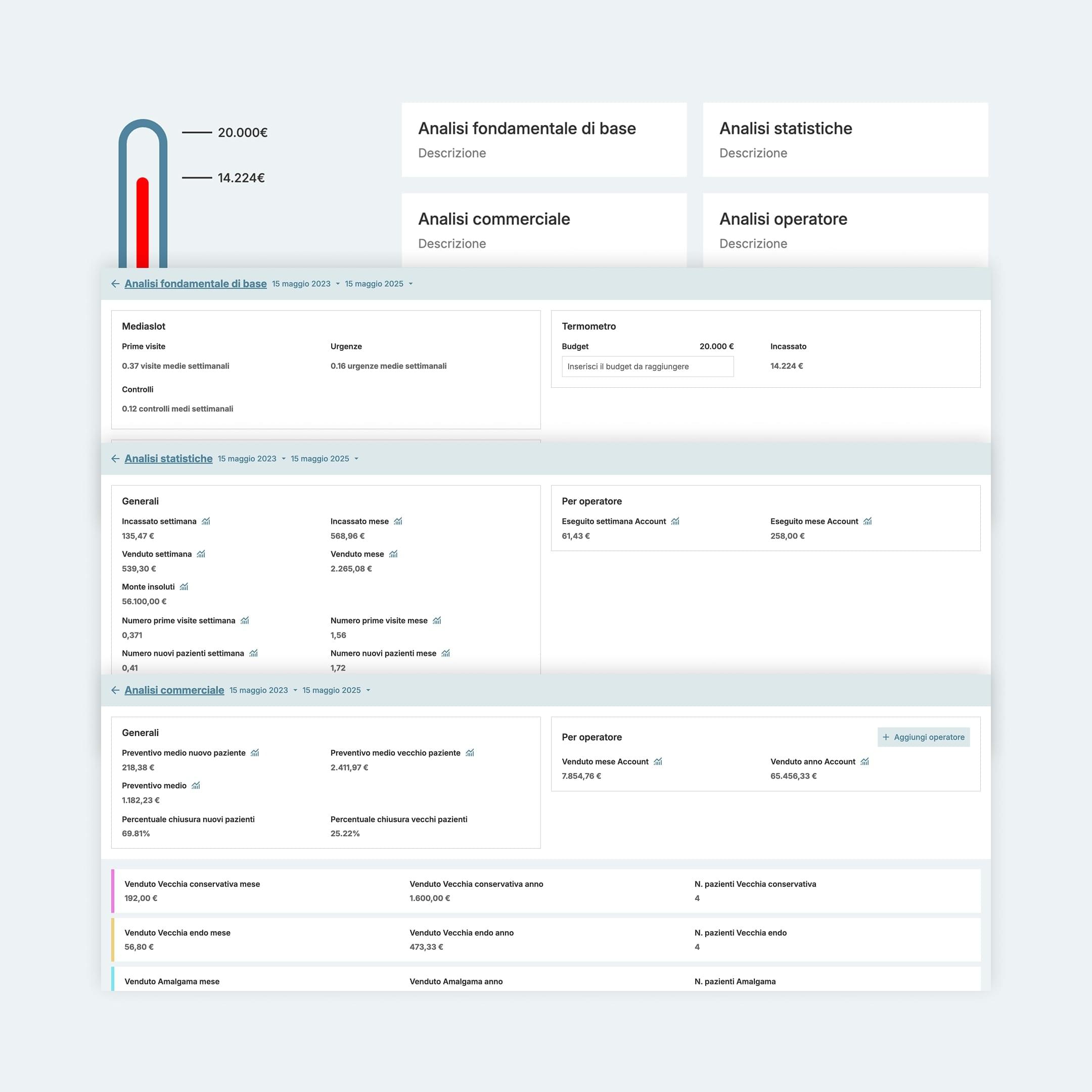 E, grazie al sistema di analisi, hai sempre sott'occhio tutte le metriche fondamentali degli appuntamenti come: eseguibile, incassabile, eseguito e incassato totale giorno, settimana, mese e anno.